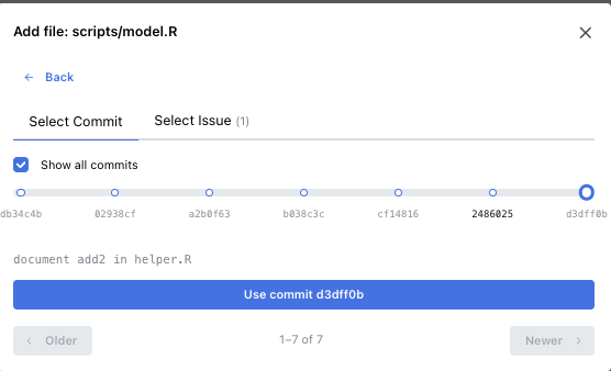 Section titled “Commit Selection”Resolve the file by selecting a commit from which the file content should be included.