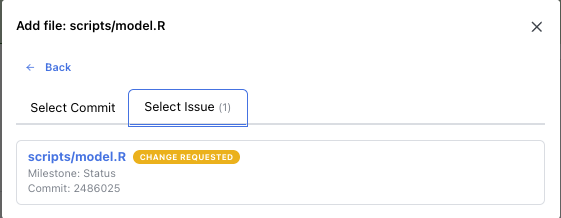 If a relevant file is added that is not tied to an issue, can select either a commit OR an issue.