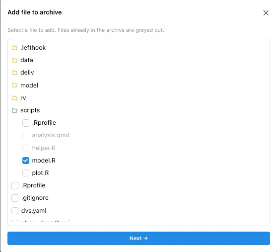 Section titled “Manually Added Files”Clicking Add file opens a modal for adding any repository file to the archive.
