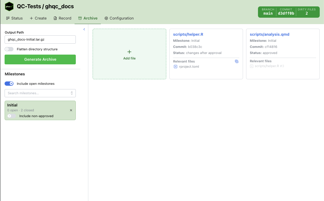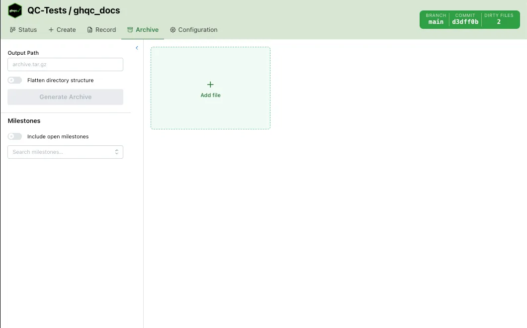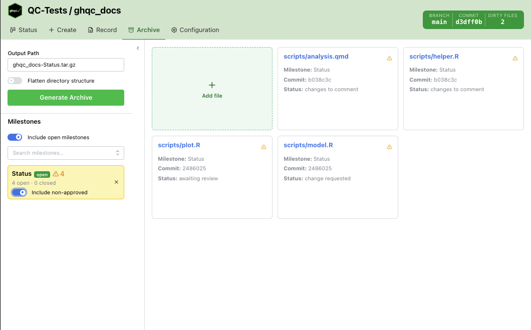 The Archive tab creates a .tar.gz bundle for one or more milestones. It builds the archive from the QC files associated with the selected milestone issues,