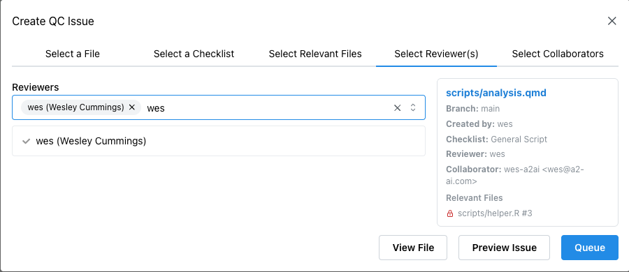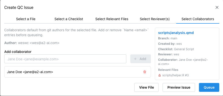 Collaborators appear in the preview card and are carried into the queued issue.