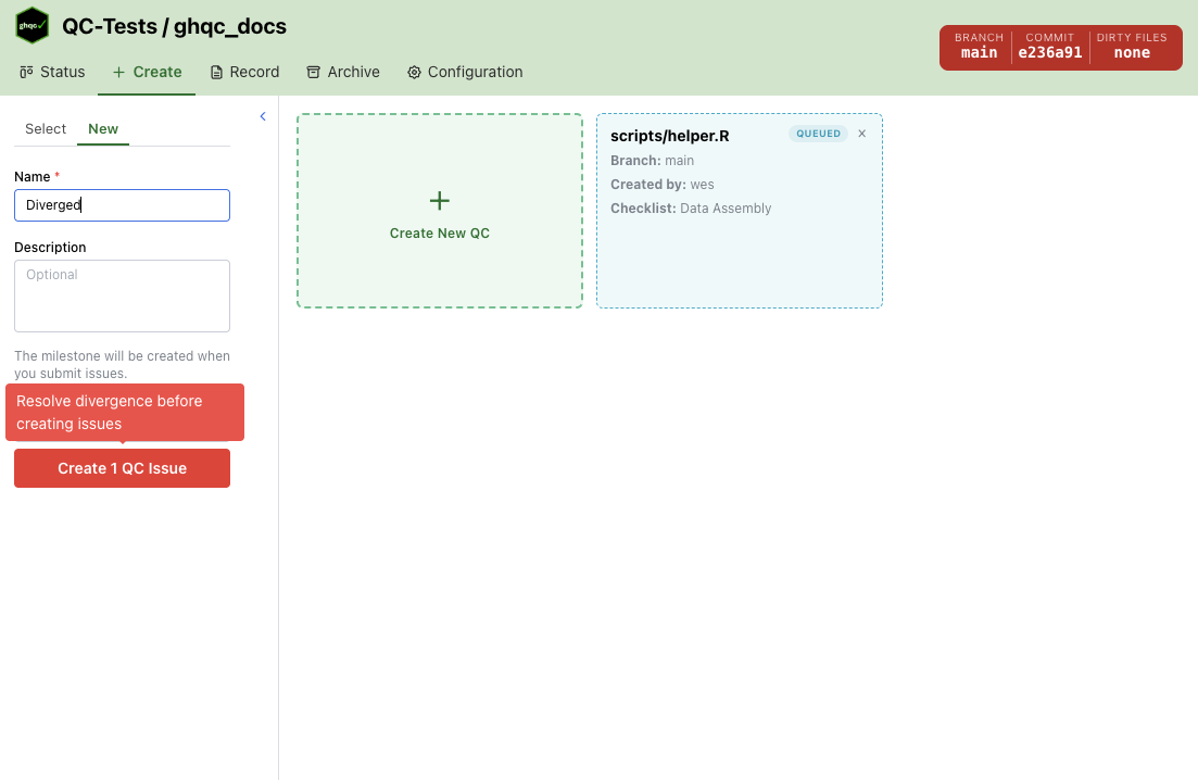 - Diverged — red warning indicating divergence must be resolved before creating issues