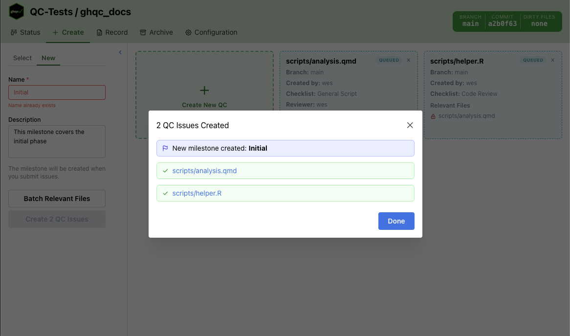 Section titled “Result Modal”Submitting the queue creates the milestone first if needed, then creates all queued QC issues.