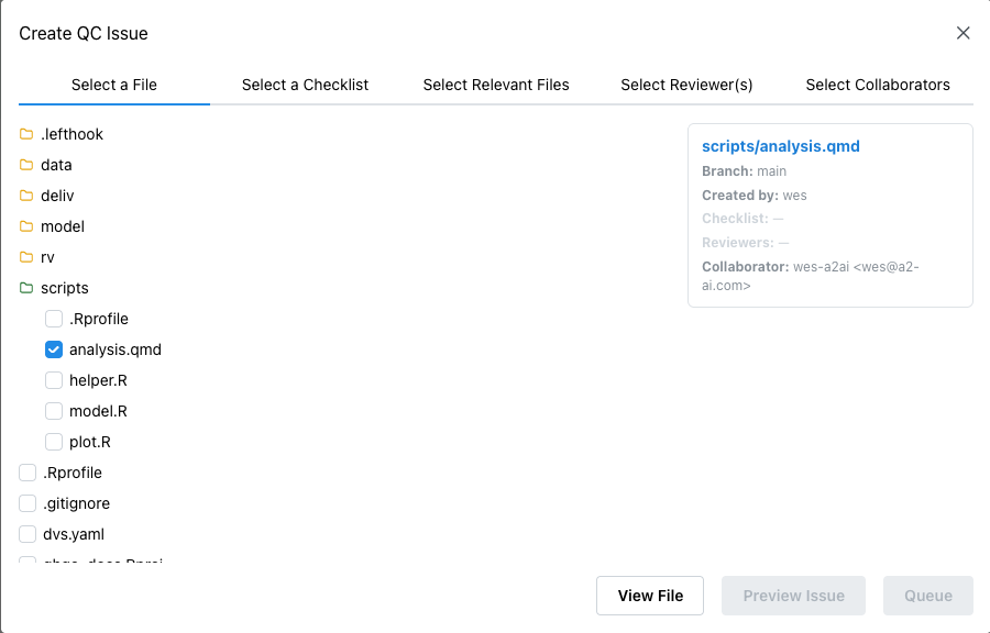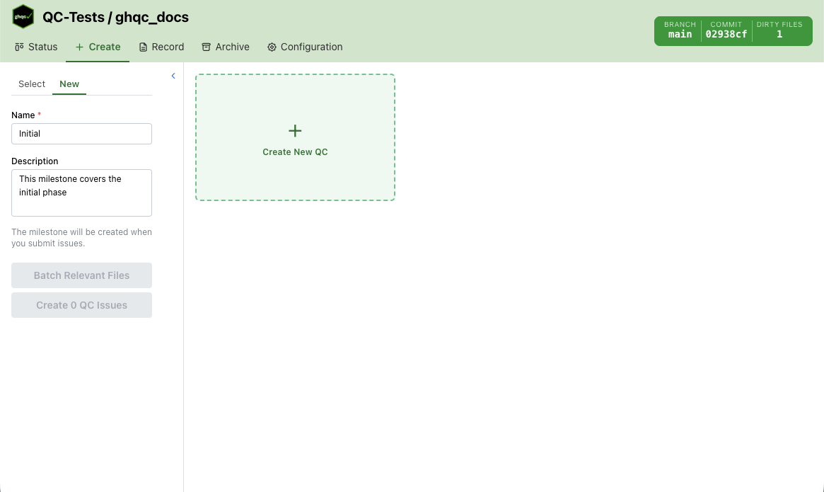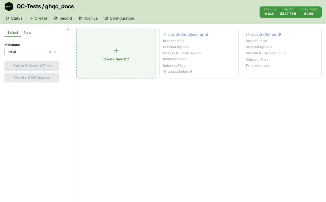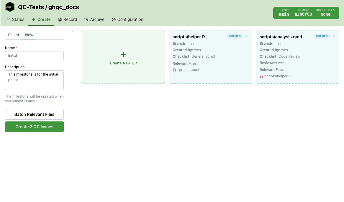 The Create tab prepares and assigns files to be QCed by selecting, or creating, milestones and adding review checklists, relevant files, reviewers, and collaborators to selected files.