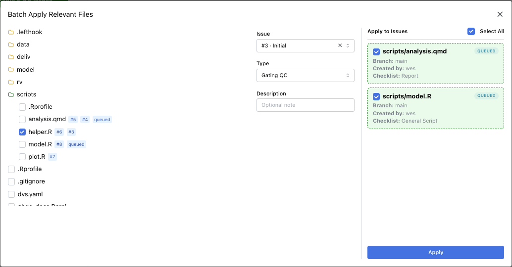 Section titled “Batch Relevant Files”If at least one issue is queued, the sidebar enables Batch Relevant Files.