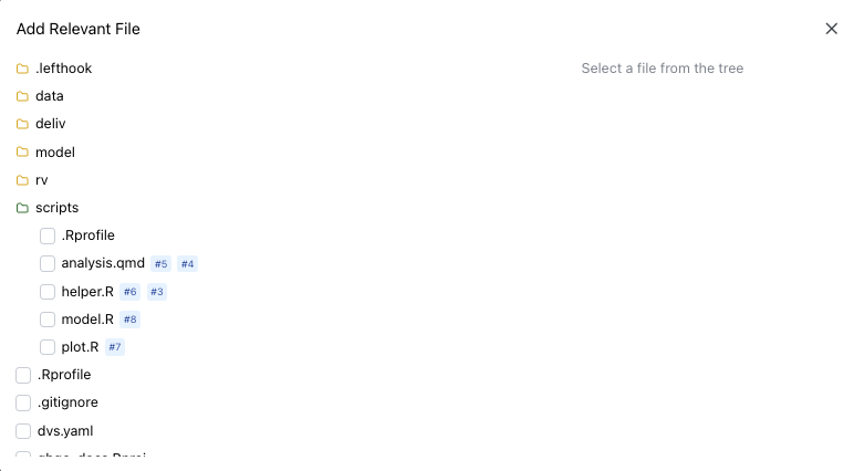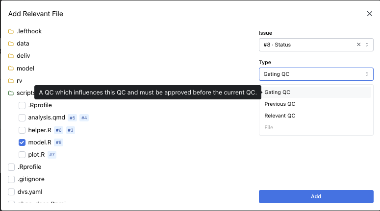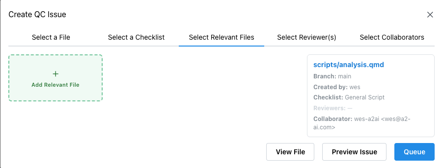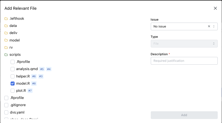 Section titled “Select Relevant Files”This tab attaches supporting references for reviewer context. Clicking Add Relevant Files opens another modal with a file tree, an issue dropdown, relevant file type dropdown, and a description.