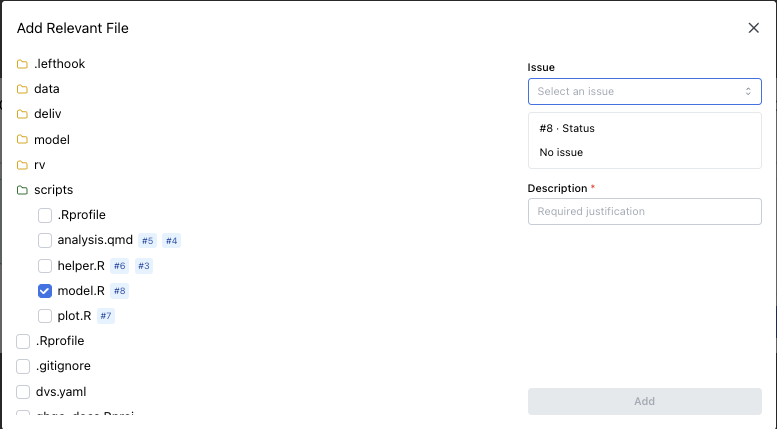 If an issue is selected, you may optionally add a description to relevant file.
