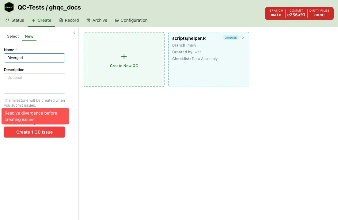 - Diverged — A red warning blocks creation. Resolve the divergence before creating issues.