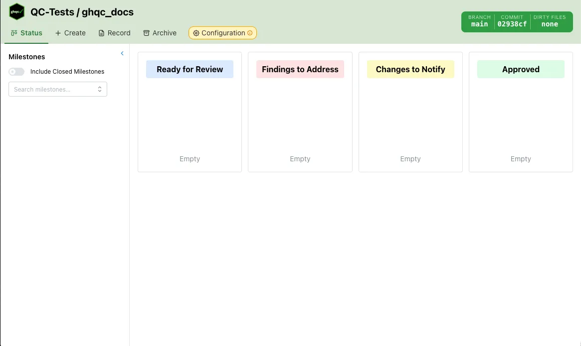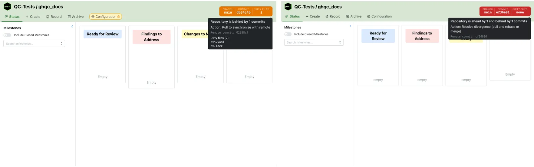 The Git Status pill is always visible in the upper-right corner of the ghqc UI.