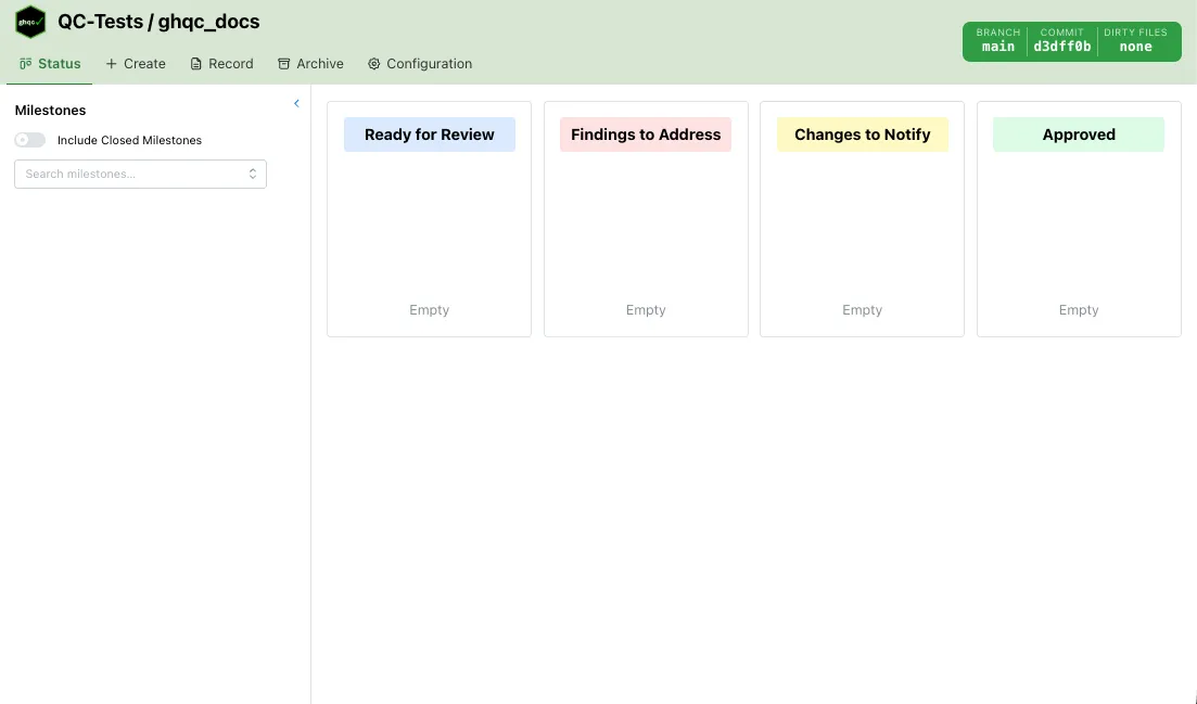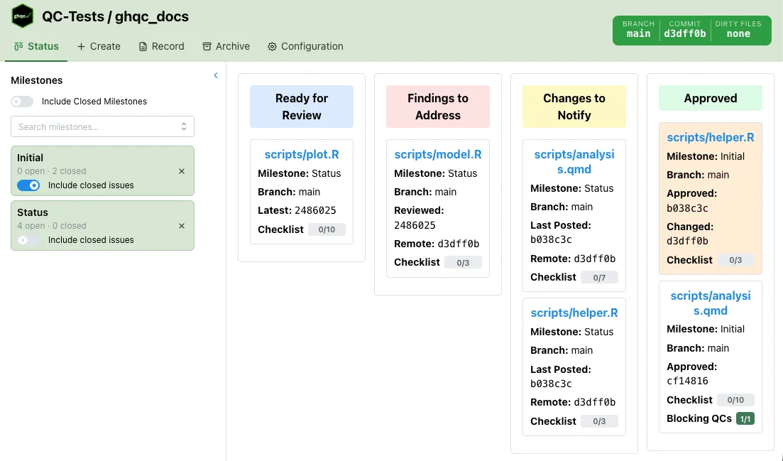 The Status tab displays all QC issues for the selected milestone as a swimlane board. Issues are automatically sorted into one of four