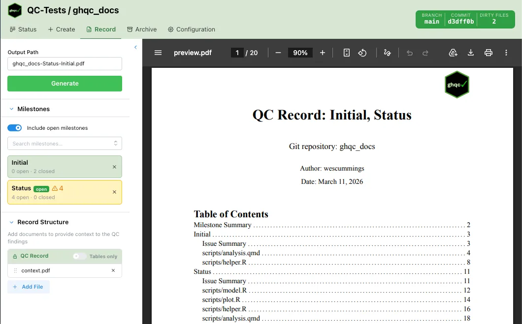 The Record tab generates a PDF QC record for one or more milestones. It is designed for assembling the final review package: selecting milestones, optionally adding context PDFs, previewing the result, and writing the finished file to disk.
