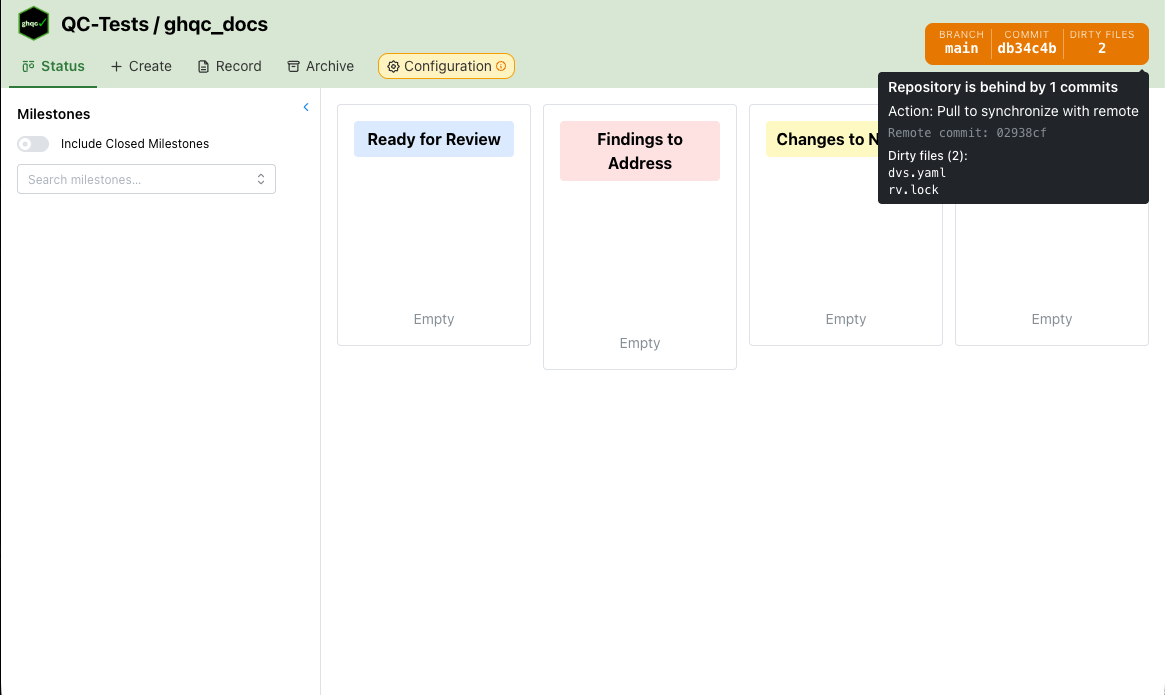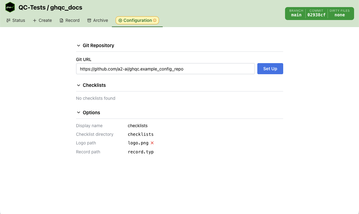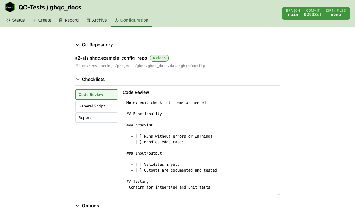 Section titled “Configuration”Once the interface is open, the next step is to set up the configuration. To make ghqc flexible across teams, we recommend using a
