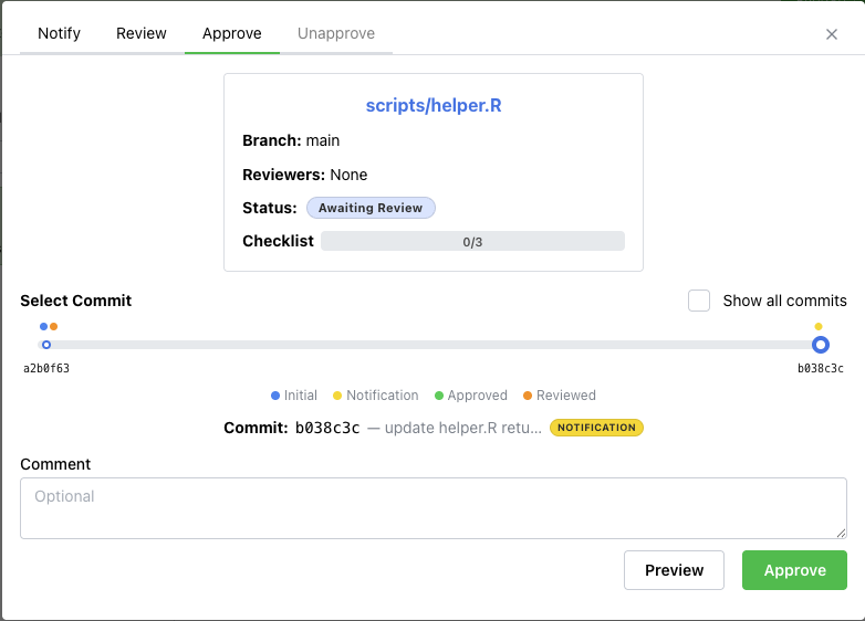 In the Approve tab, you can select the commit to approve, add an optional comment, and preview the comment.
