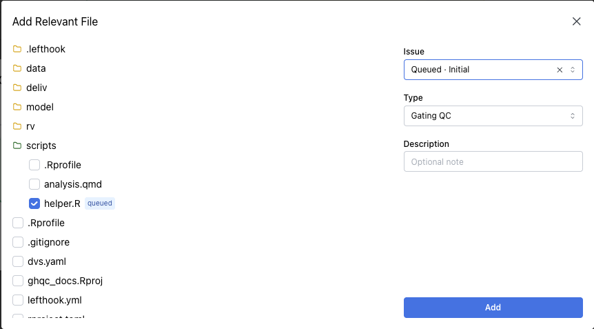 ghqcsupports several types of relevant files, including previous QC issues, gating QC issues, related QC issues, and related files without a QC issue. For more detail on how each type affects approval, see the Relevant Files concept page.To add a relevant file, select Add Relevant File. This opens a pop-up with a file tree. Files that already have QC issues will also show their issue number.
