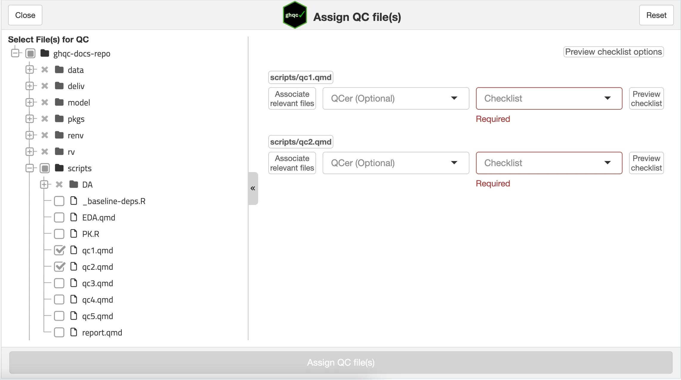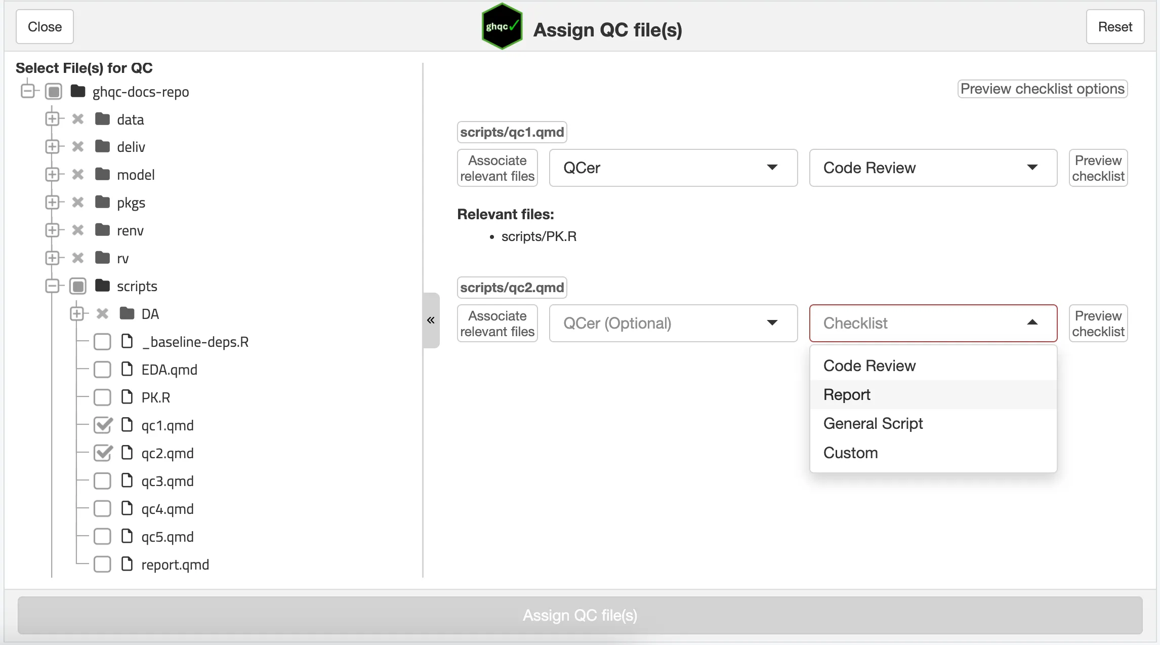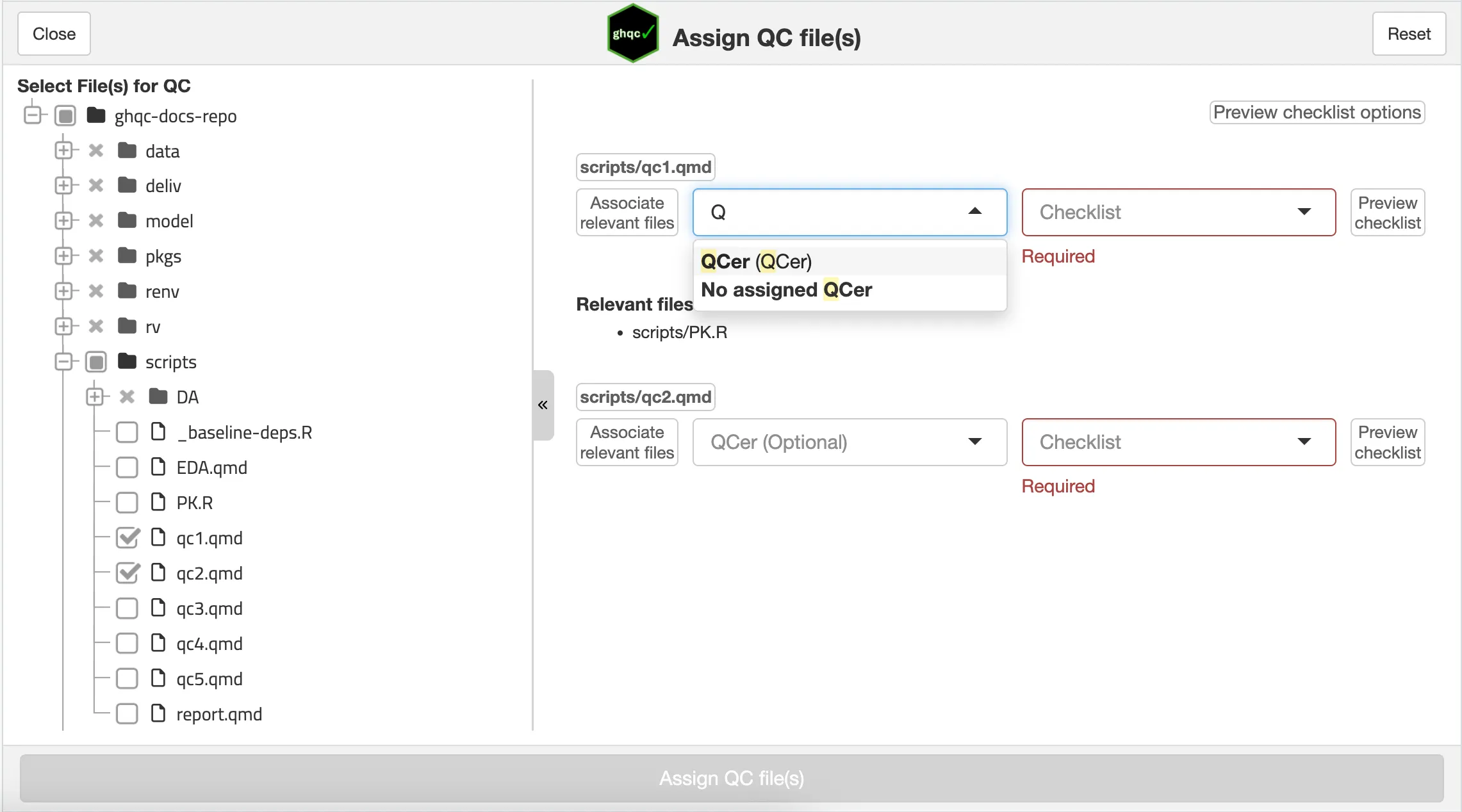 library(ghqc)ghqc_assign_app()Using the Addins dropdown in the RStudio navigation bar, search for ghqc, then select “Assign QC file(s)”.