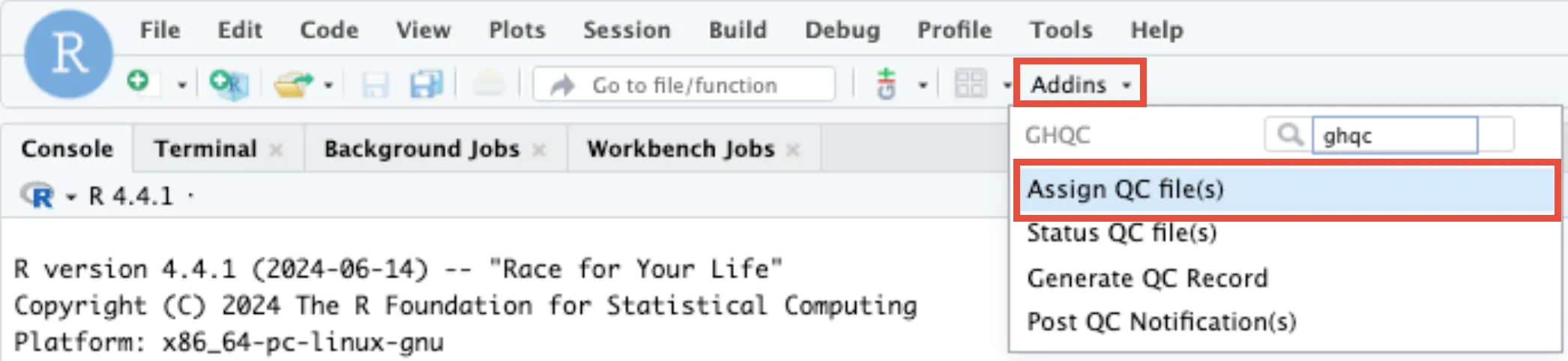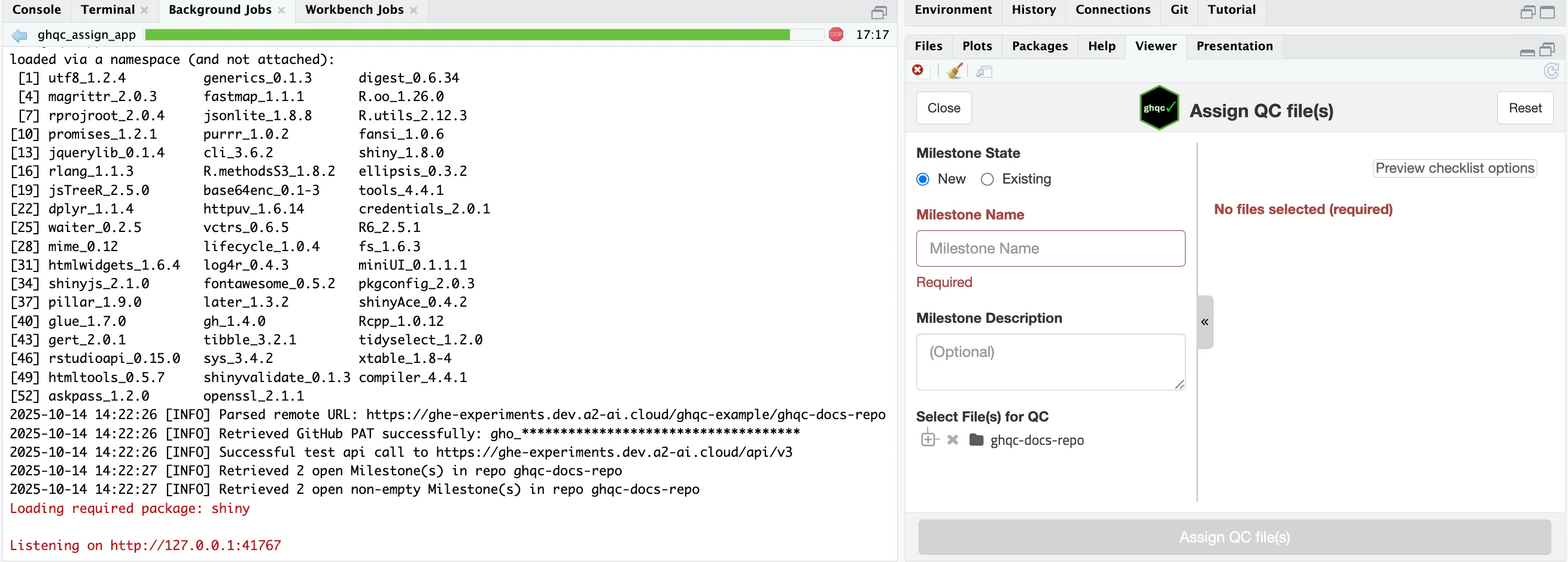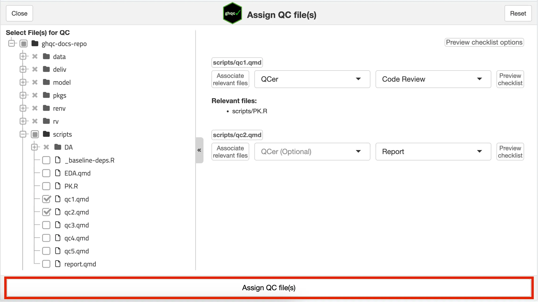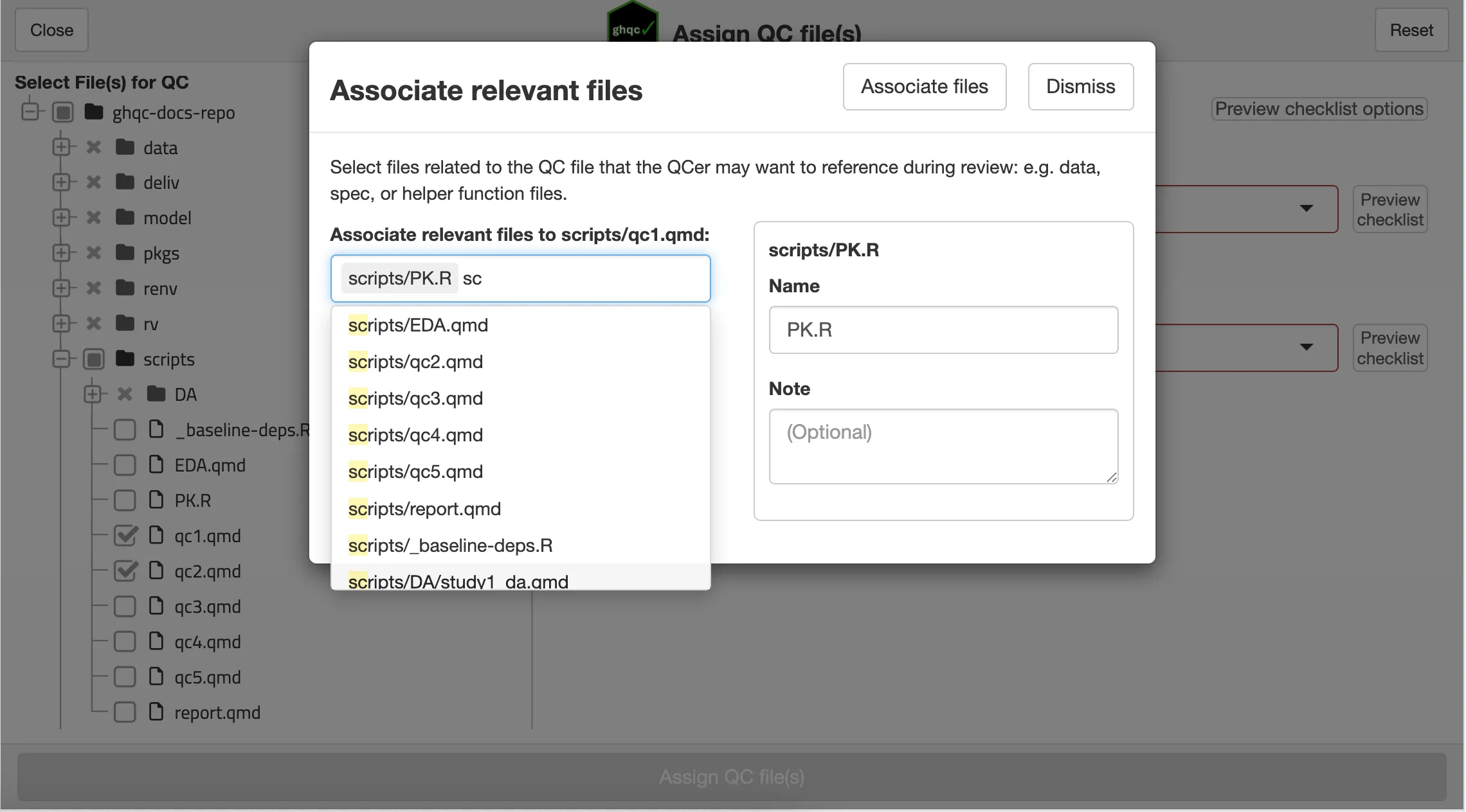 library(ghqc)ghqc_assign_app()Using the Addins dropdown in the RStudio navigation bar, search for ghqc, then select “Assign QC file(s)”.