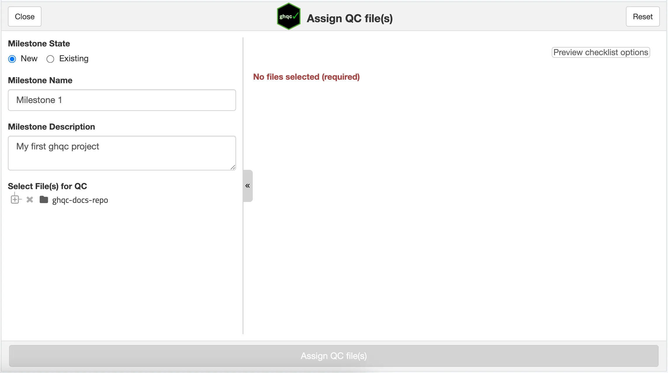 Once your desired configuration is set-up, with at least each selected file having a checklist, the “Assign QC file(s)” button will activate. Clicking this button will create the issues within the new milestone.