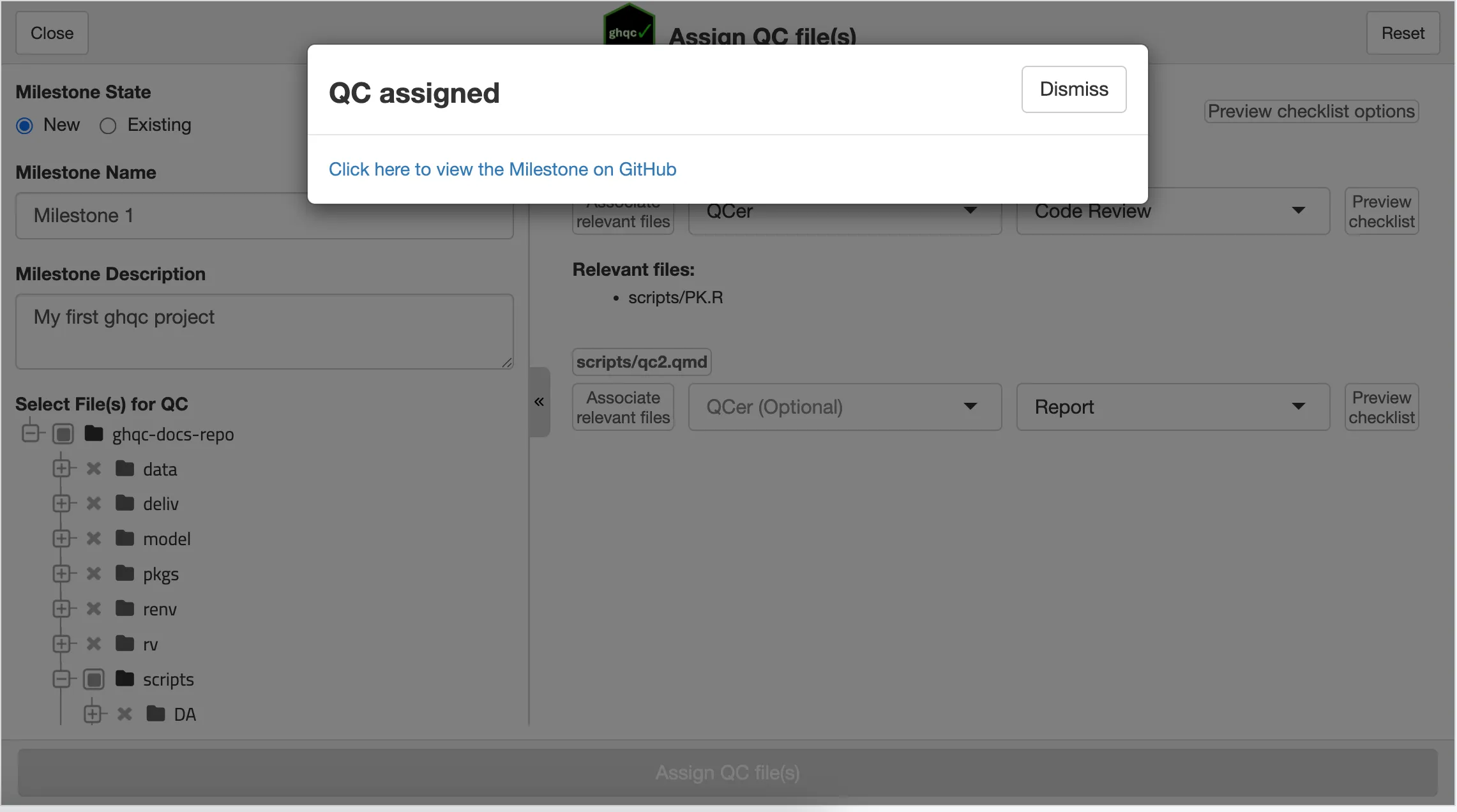 After assigning the files for QC, a pop-up will appear that the QC was successfully initialized with a URL to the created Milestone.