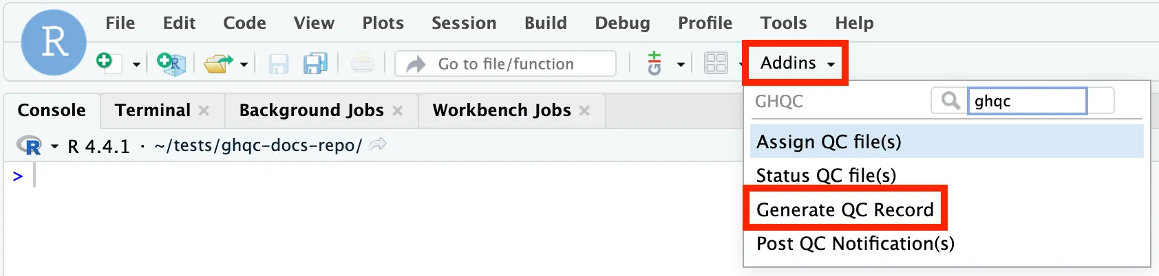 library(ghqc)ghqc_record_app()Using the Addins dropdown in the RStudio navigation bar, search for ghqc, then select “Post QC Notification(s)”.