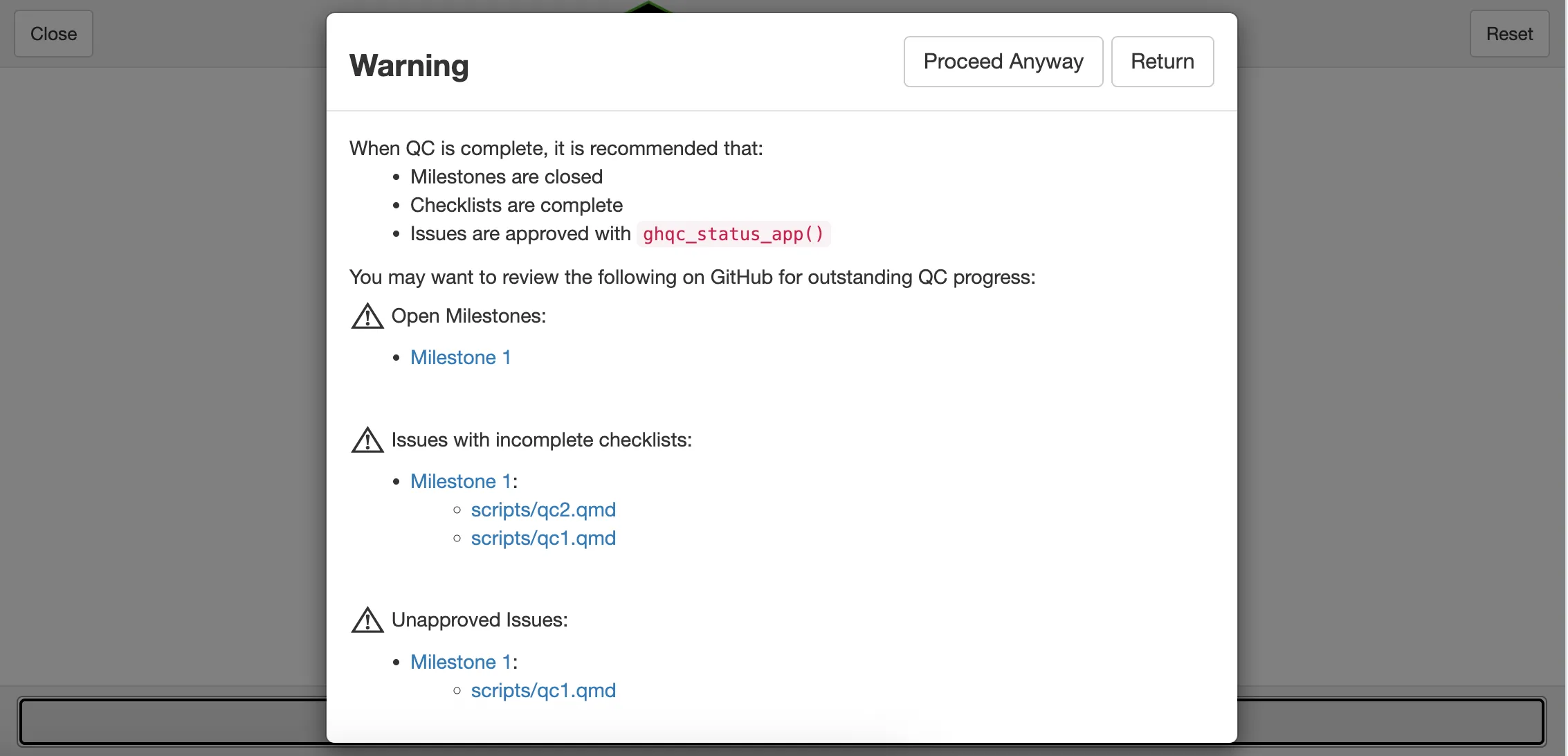 Section titled “3. Generate QC Record”After selecting Generate QC Record, we will have a pop-up warning indicating we have open milestones and incomplete/unapproved issues.