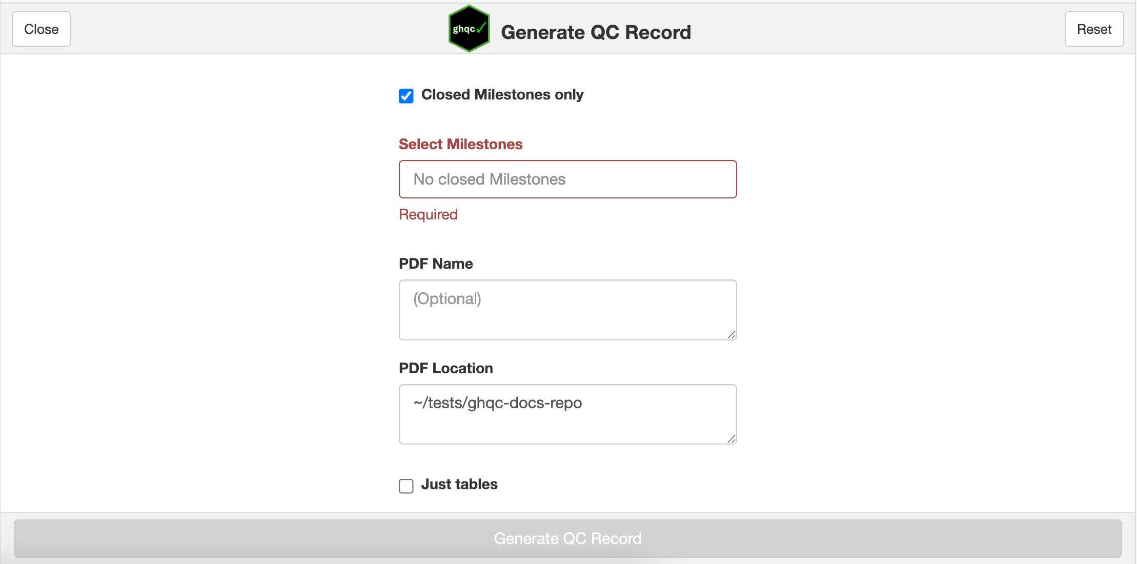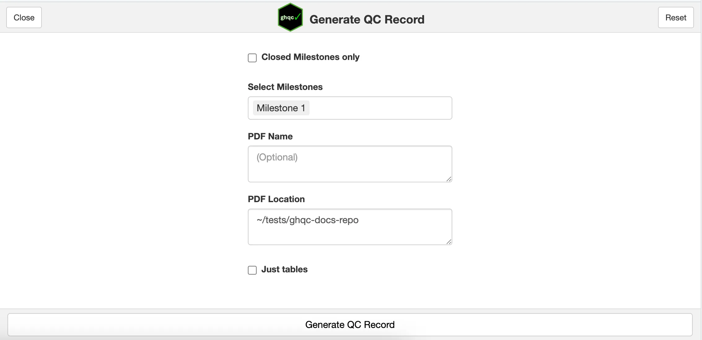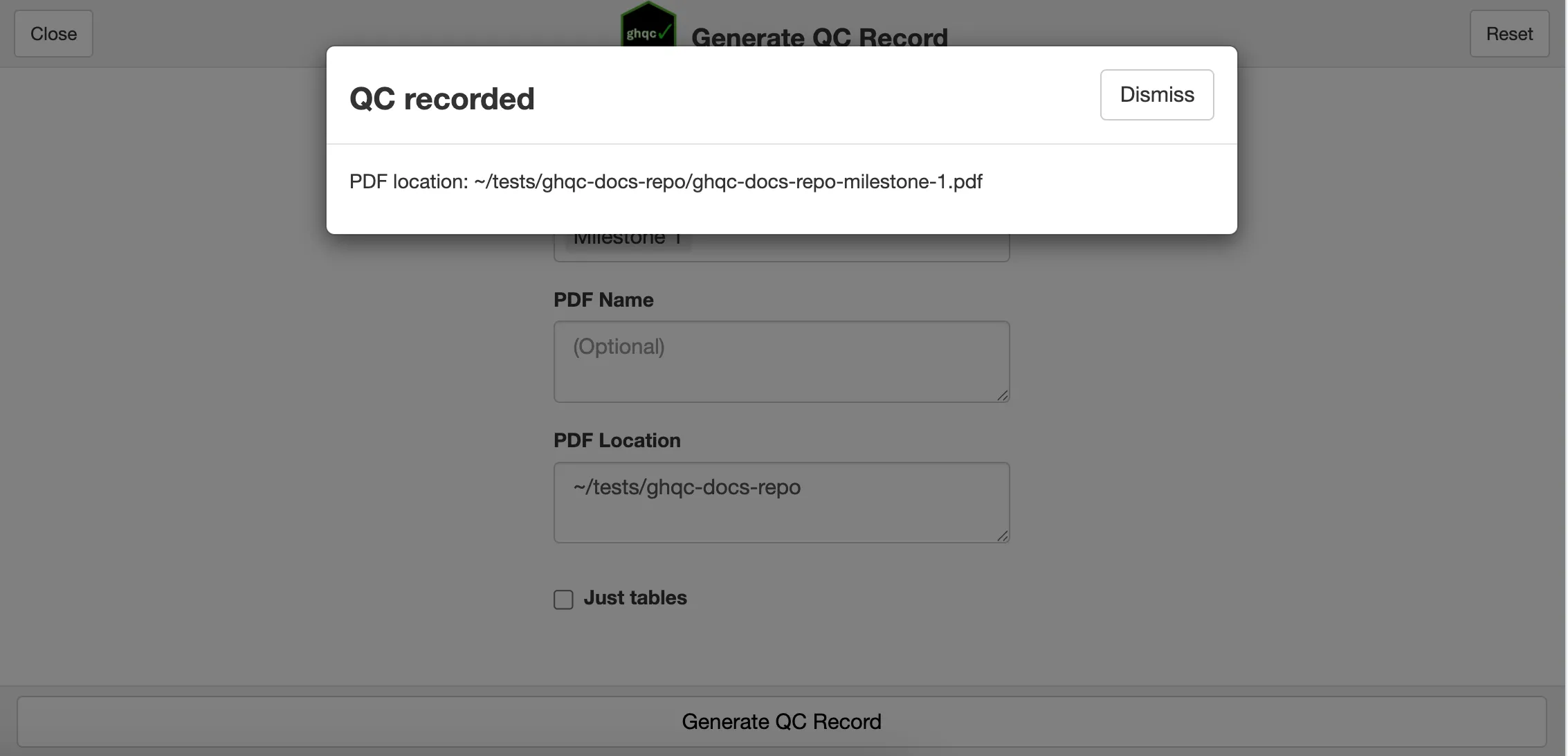 In this example, we’ll leave it as blank and expect our PDF name to be “ghqc-docs-repo-Milestone-1.pdf”.