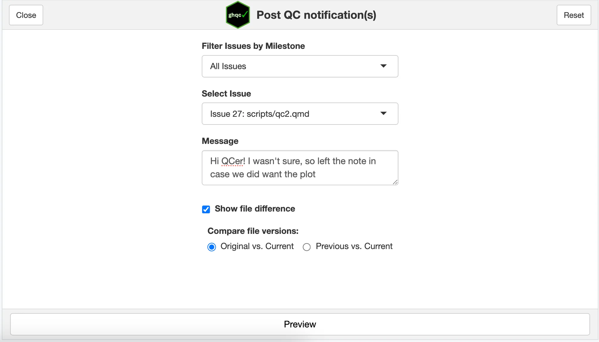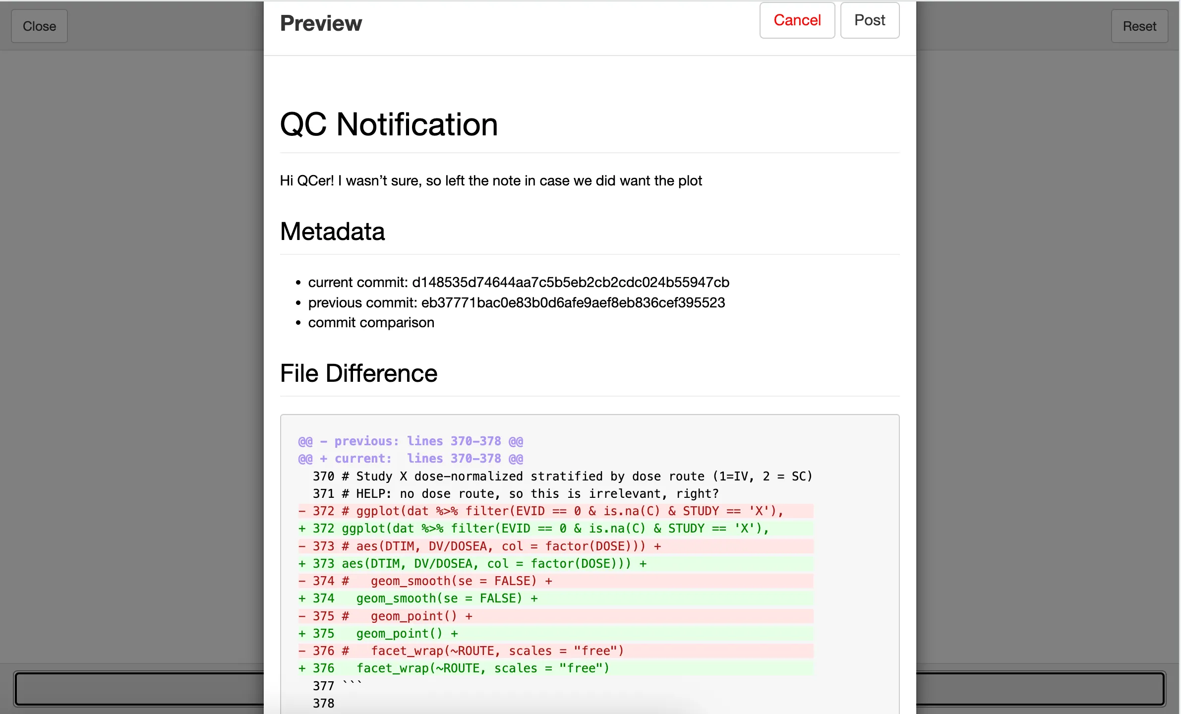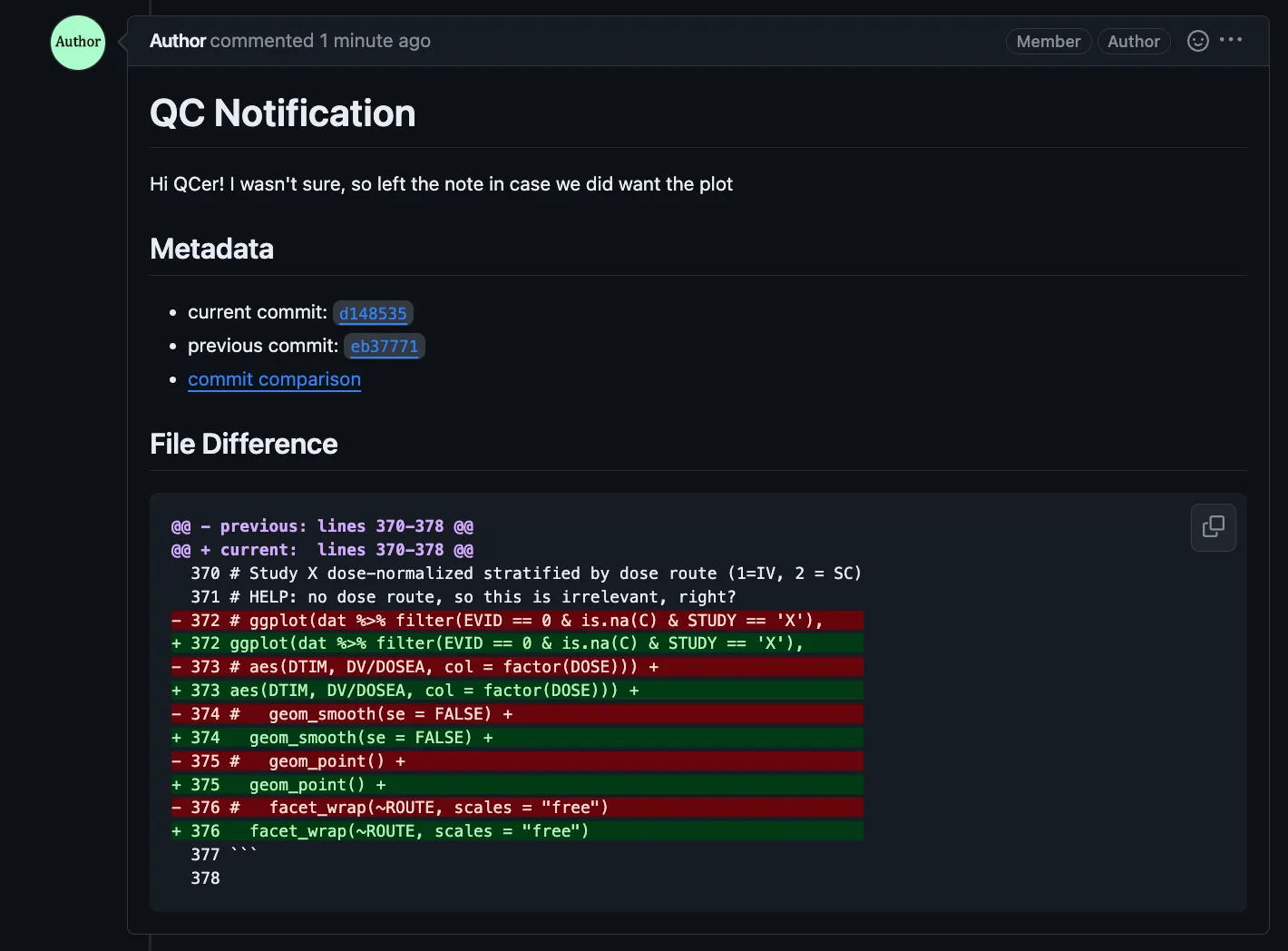 After the edits are pushed, we can notify the QCer and include the difference in the file changes using ghqc Notify app.