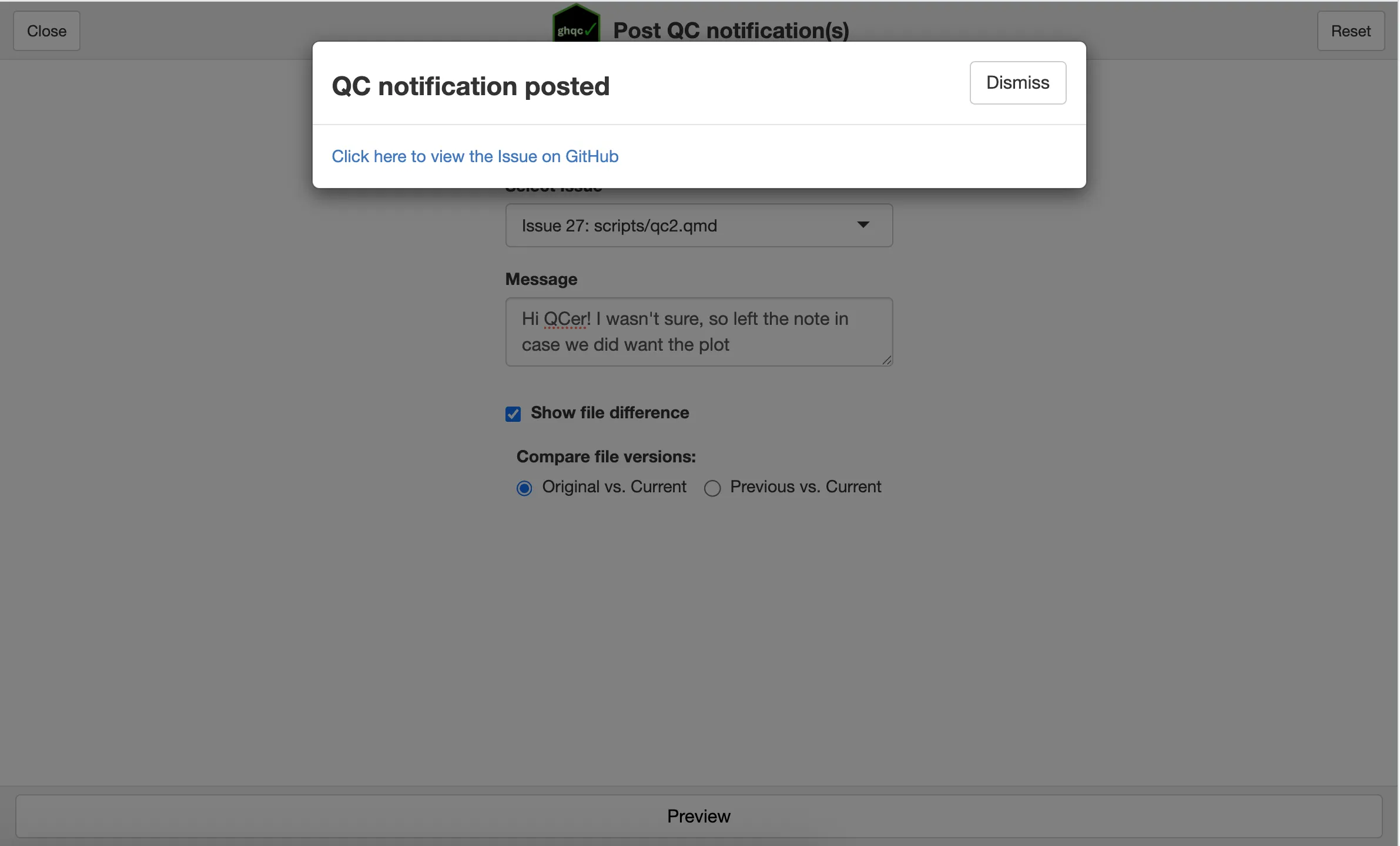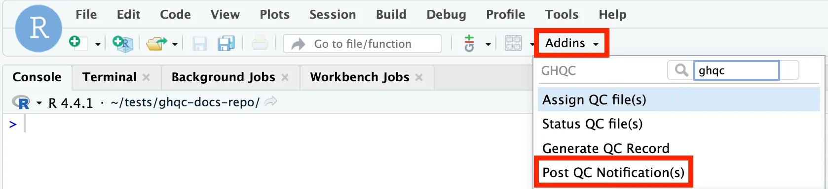 library(ghqc)ghqc_notify_app()Using the Addins dropdown in the RStudio navigation bar, search for ghqc, then select “Post QC Notification(s)”.