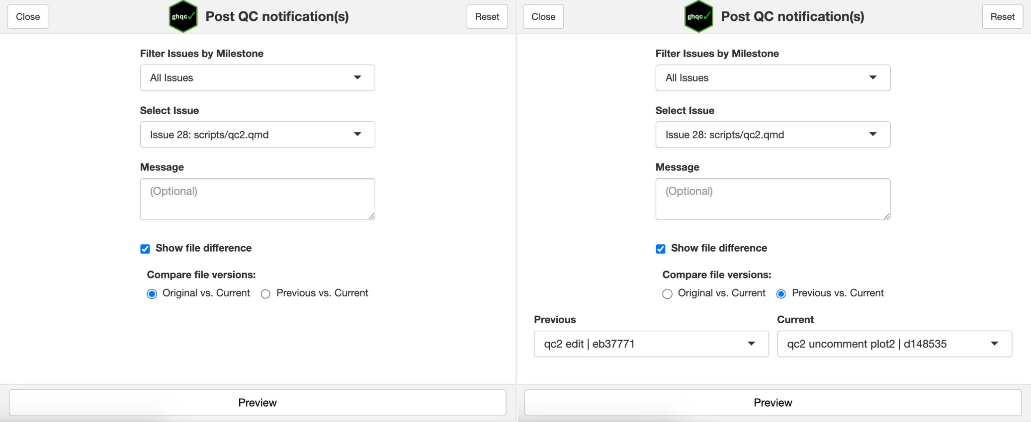 Section titled “Compare File Versions”By default, the Notify app will select the current commit and the initial, or original, QC commit to compare against. The radio button allows users to select any desired commits from a dropdown.